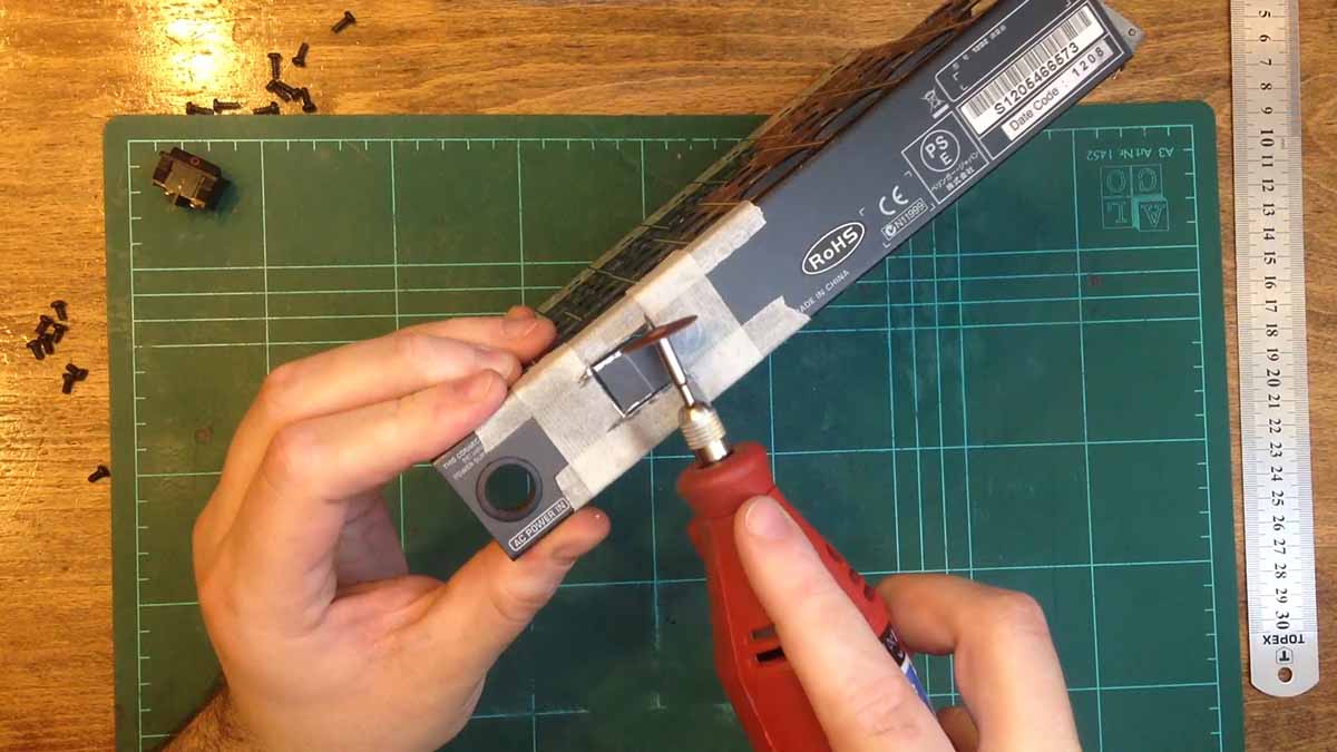 Using my rotary tool and a cutting disk, I made the cutout for the switch. I removed the bit of steel from the outer case with some pliers and a screwdriver. I then sanded the cutout with an abrasive stone and some hand files.